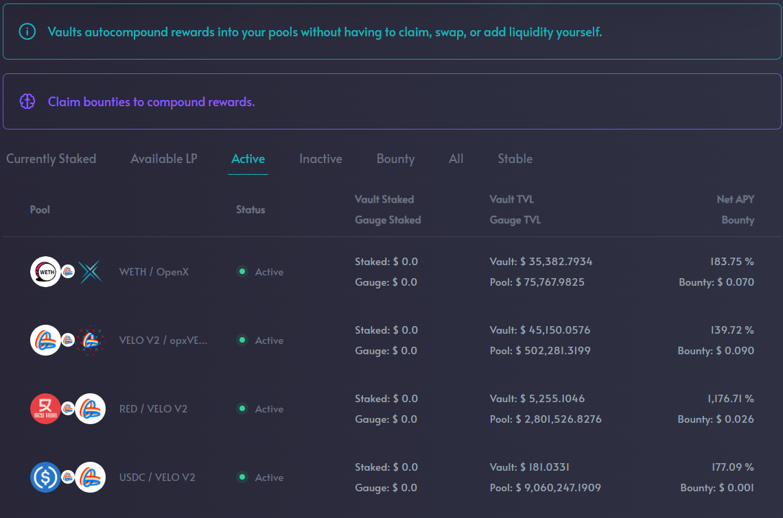 As of this writing, our vaults have the lowest fees (and thus highest APYs) on Optimism and Base. There is no deposit or withdrawal fee. Vaults compound when a user deposits or claims a vault bounty.&#x20;